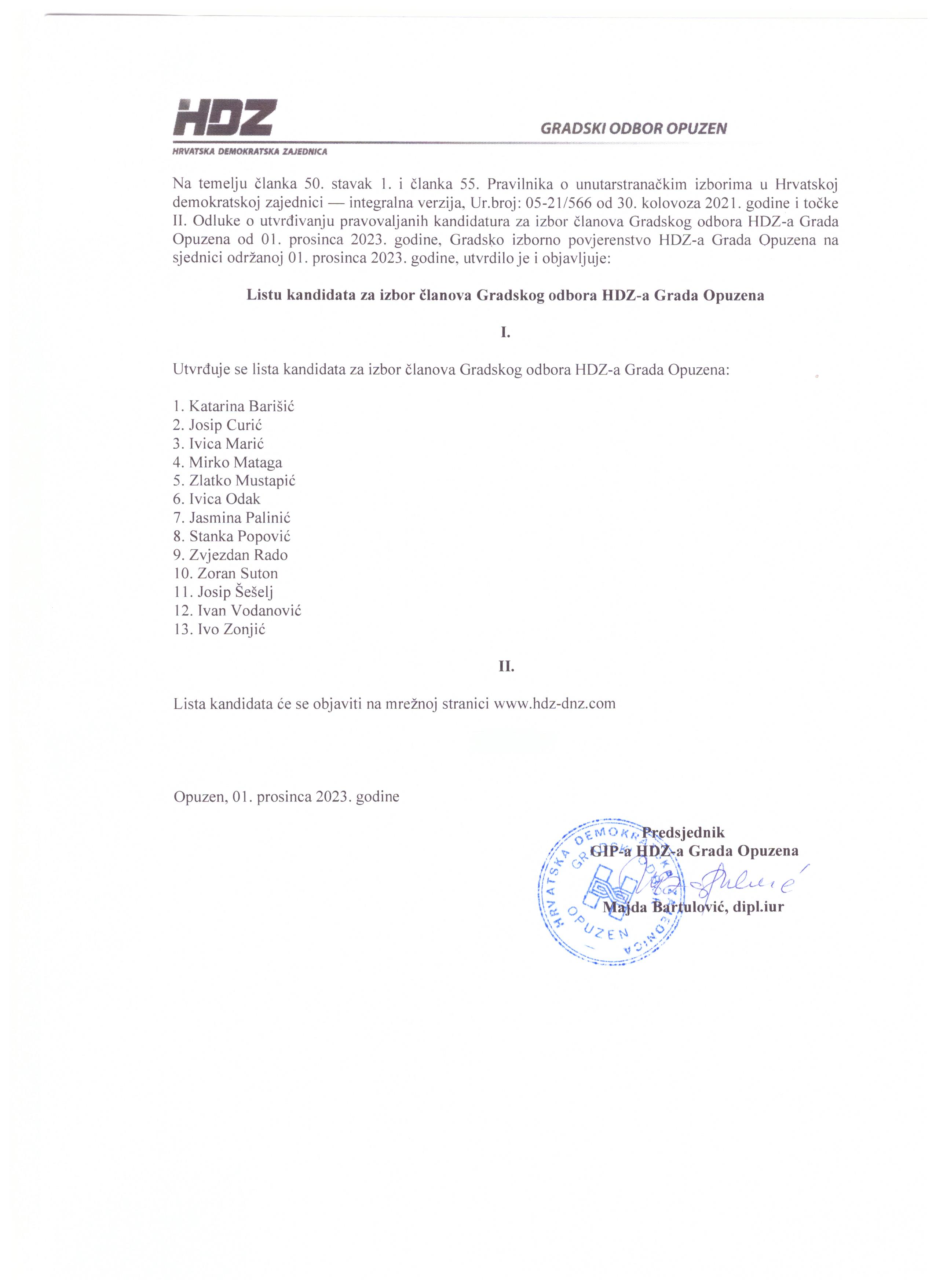 | Potpisi potpore kandidaturi za izbor predsjednika gradske organizacije HDZ-a grada | 2022-07-30 |